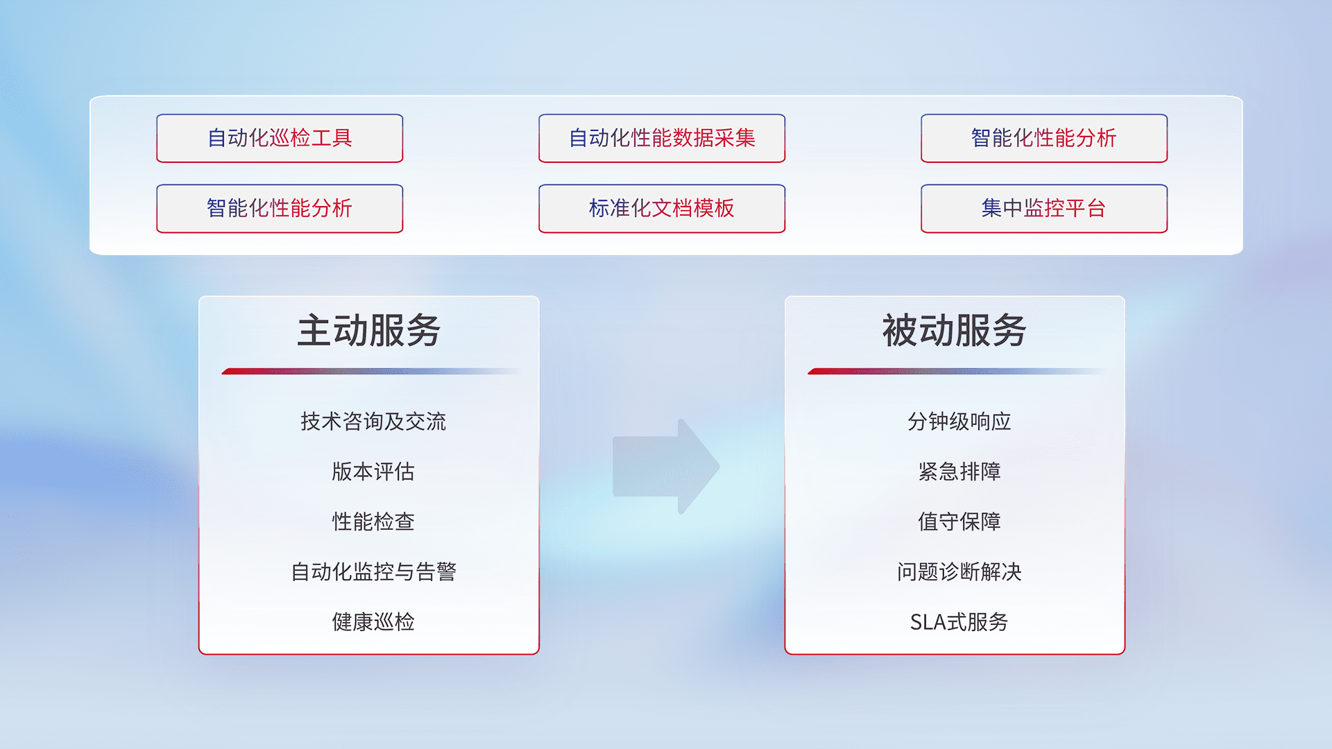 智能化工具和标准化文档,,保障服务质量,,提供主动服务(包含技术咨询、、版本评估、、性能检查、、、自动化监控与告警、、、健康巡检)和被动服务包含(分钟级响应、、、、紧急排障、、、值守保障、、、问题诊断解决、、、、SLA服务)。。。。